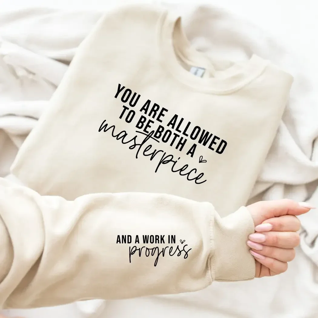 Ihanan pehmeä collegepusero, englanninkielisellä mietelauseella.